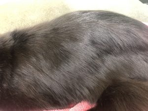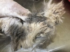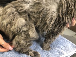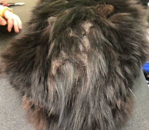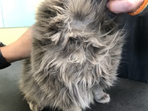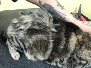 If mats are not removed, they can begin merging into a pelt, which is a hard covering of matted, twisted hair covering large portions of the cat’s body. Pelts cannot be removed through brushing, they can only be removed through shaving. A cat who is pelted is a cat who is suffering. Pelting can also inhibit their movement or make urination and defecation more difficult, or even impossible. Risks of pelting include open sores, skin infections, permanent hair loss, bruising, urine burn/scalding, joint problems, muscle atrophy, and septic infections. If pelts are not removed, they can become life threatening. Cats who are severely pelted may need to have their grooms spread out over two appointments to allow the prevent the cat from over-stressing and to allow the skin to heal. Please note that pelt removal fees will double each time the pet returns pelted.